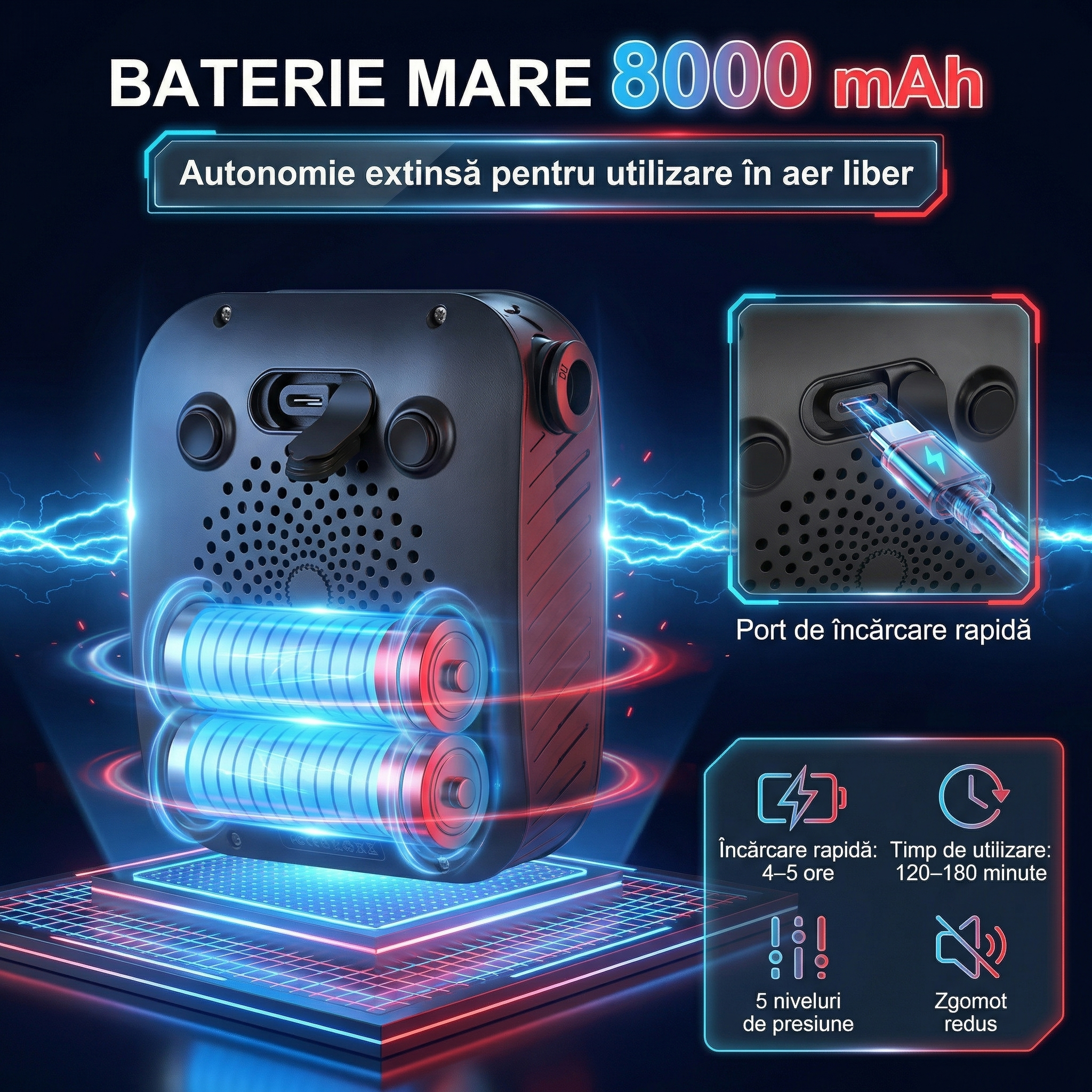 Bateria de 8000mAh oferă între 80 și 180 de minute de utilizare, în funcție de nivelul de presiune selectat.