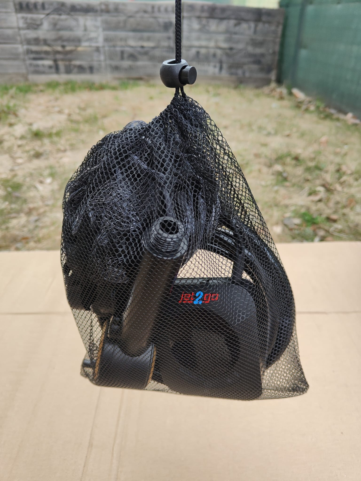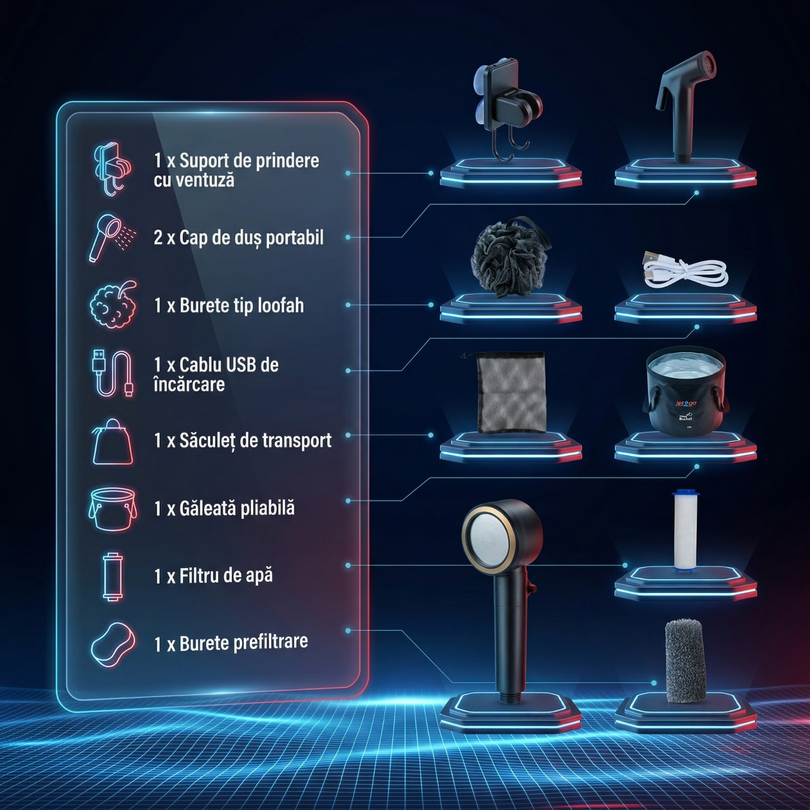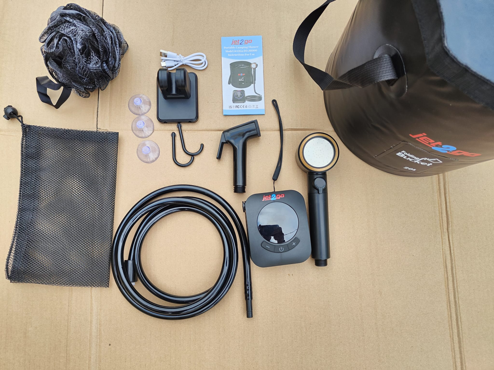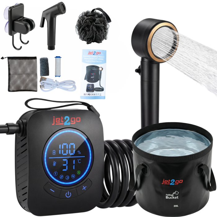 Jet2Go vine echipat complet: pompă puternică, cap de duș reglabil, furtun de 2m, găleată pliabilă 20L, burete de duș, cap tip T, filtru apă și geantă de transport.