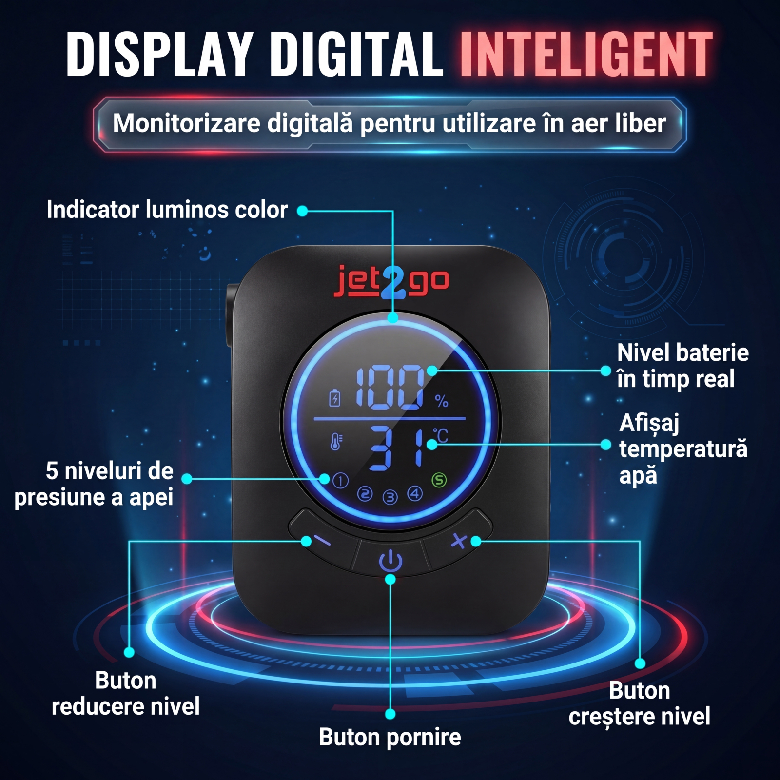 Afișează nivelul bateriei, temperatura apei și puterea pompei – control complet în timp real.