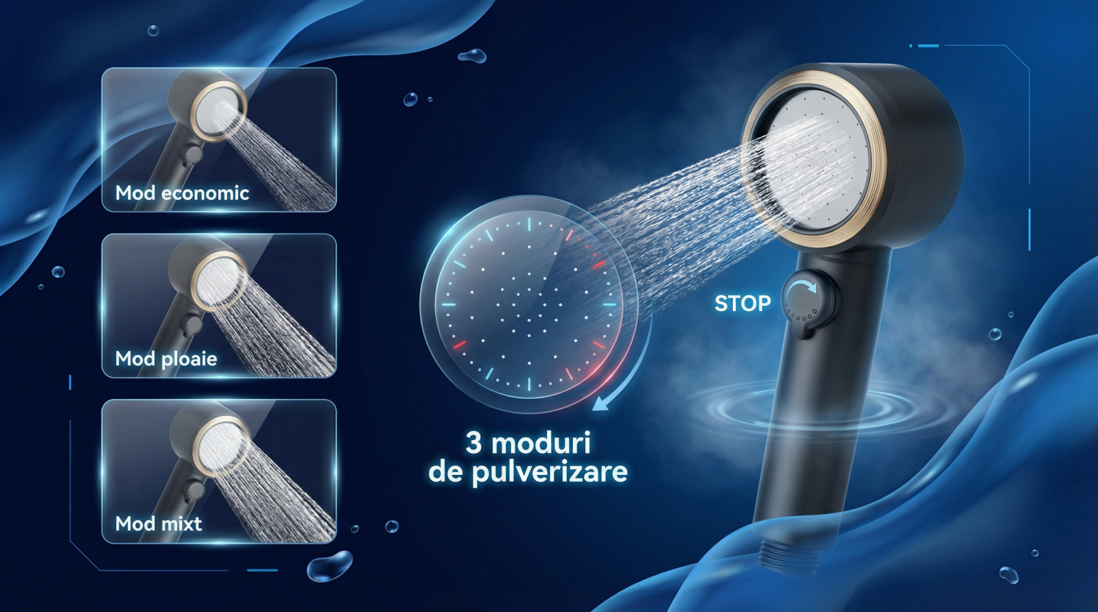Alege modul perfect: pulverizare fină, ploaie, jet sau combinat. Control total al presiunii direct din dispozitiv.