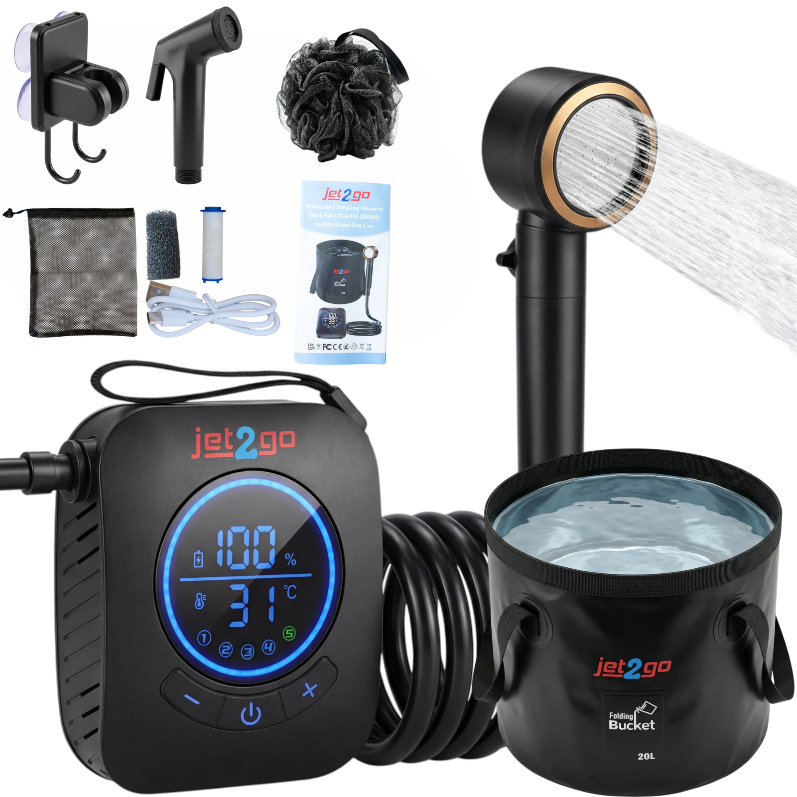 Duș Portabil Reîncărcabil Jet2Go D3 J8000 – Set Complet Premium